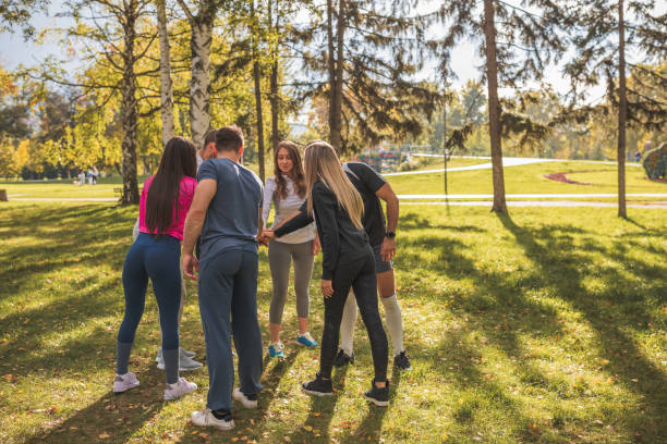 Young group of people putting their hands together as a team. There are both female and males. Its beautiful sunny day.